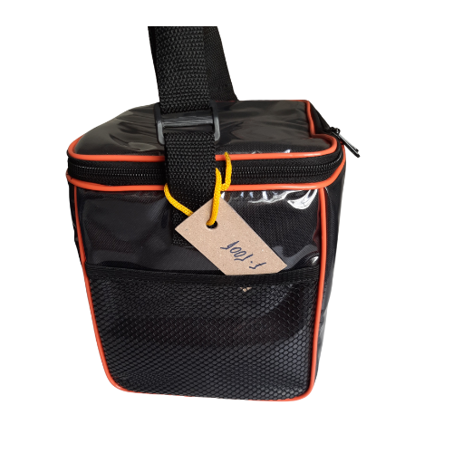 Bolsa térmica ideal para transporte de  latas de refrigerantes, cervejas, sucos ou frutas. Tecido externo personalizado em serigrafia, recheio com espuma pack 6mm para isolação térmica e forro em laminado de pvc (plástico) branco, possui bolso em 01 lateral feito em tela de poliéster com acabamento viés. Fechamento com zíper médio n.5 ou zíper grosso n.8 acabamento com fio plástico 11mm e alça em cadarço de polipropileno de 30mm com regulagem de comprimento.  Neste exemplo o cliente optou pela bolsa revestida de plástico transparente (opcional).  Detalhe: o acabamento interno pode ser com viés (costura) em toda a extensão da bolsa, ou acabamento com bolsão inteiriço de PVC branco, uma garantia contra vazamento líquido (bolsão).