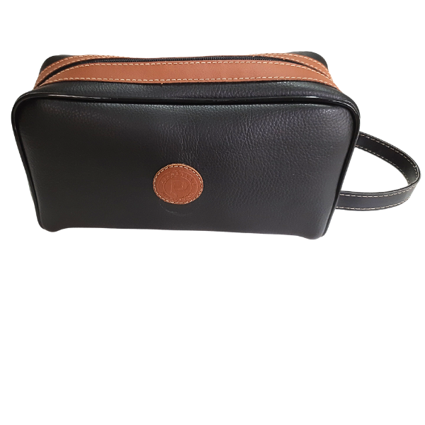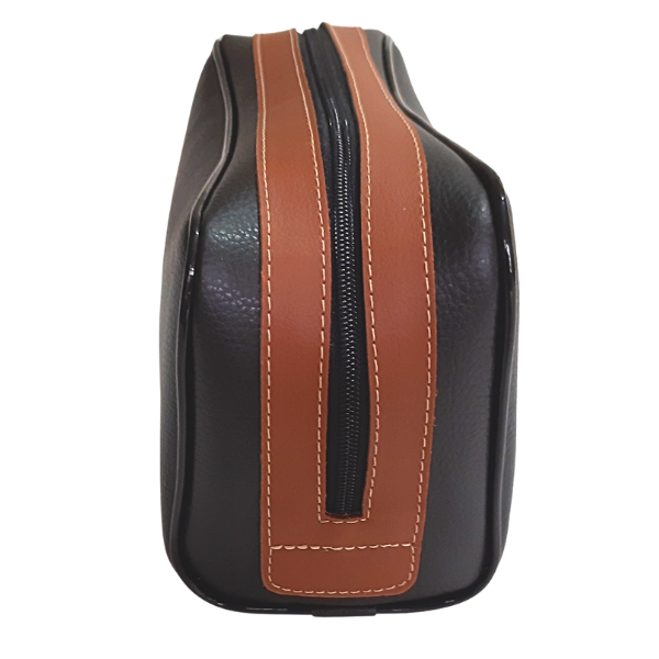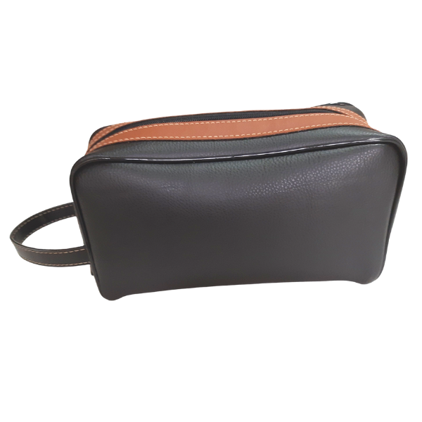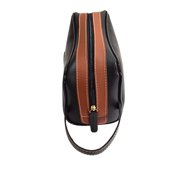 Nécessaire feita em couro animal, corpo principal na cor preta e detalhes de acabamento ao redor do zíper na cor caramelo. Alça de mão no mesmo material, etiqueta com logomarca com impressão em baixo relevo. Contorno com fio plástico 11 mm brilho. Um produto artesanal.